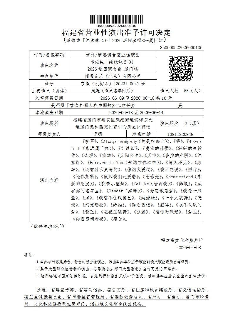 福建省营业性演出准予许可决定(单依纯「纯妹妹2.0」2026巡回演唱会-厦门站)