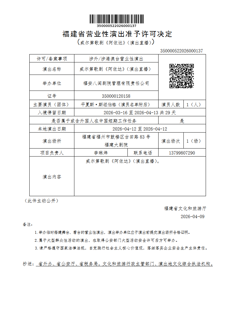 福建省营业性演出准予许可决定(威尔第歌剧《阿依达》(演出直播))