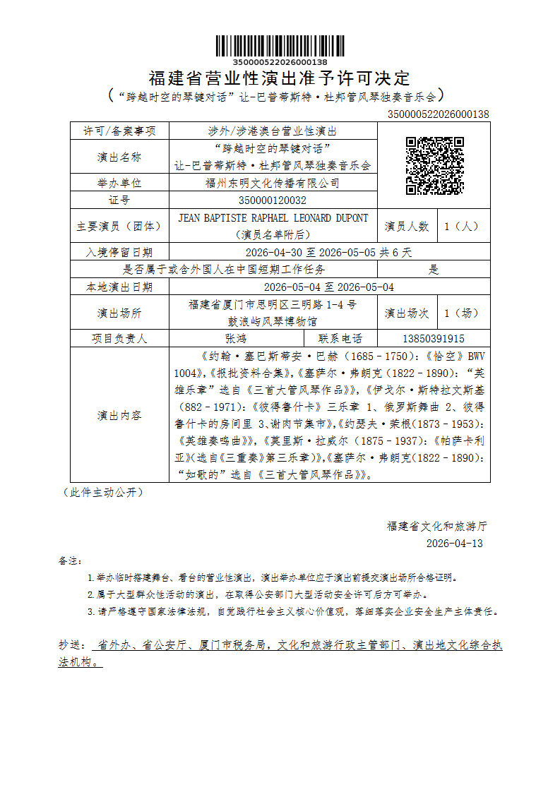 福建省营业性演出准予许可决定(“跨越时空的琴键对话”让-巴普蒂斯特·杜邦管风琴独奏音乐会)