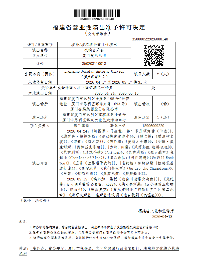 - 内容概述: 福建省营业性演出准予许可决定(交响音乐会)