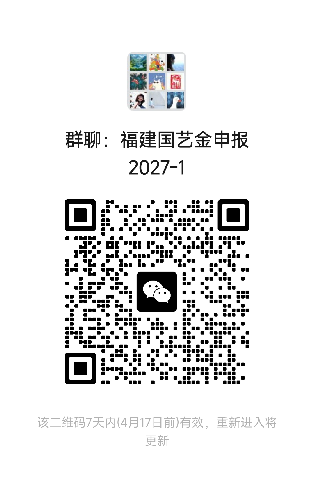 注:已进“福建国艺金申报”其他群的请不要重复加群。二维码如过期,请与厅艺术处工作人员电话联系。