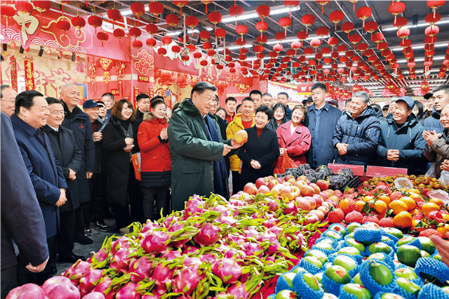 2025年1月22日至24日,中共中央总书记、国家主席、中央军委主席习近平冒着严寒来到辽宁,看望慰问基层干部群众。这是23日上午,习近平在沈阳大东副食品商场考察时,同店主和顾客亲切交流。 新华社记者 王晔/摄