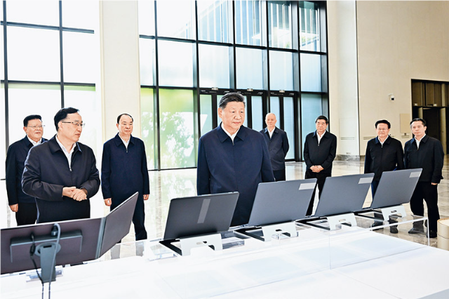 2025年11月7日至8日,中共中央总书记、国家主席、中央军委主席习近平在广东考察。这是8日上午,习近平在广州察看广东科技创新和产业创新融合发展成果展示。 新华社记者 燕雁/摄