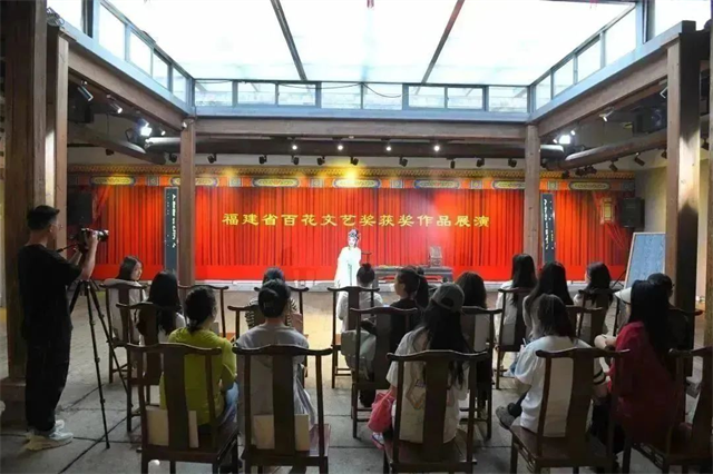 9月28日,省委常委、宣传部部长张彦,福建省文旅厅党组成员、副厅长吴新斌等领导莅临福建省百花文艺奖历届获奖作品精品展开幕式现场观看演出。福建省实验闽剧院院长、一级演员、文华奖、梅花奖获得者周虹带领优秀青年演员携闽剧《双蝶扇》亮相福建省海峡民间艺术馆。上午、下午、晚上共计五场演出,作为福建省百花文艺奖获奖作品展演首演剧目与游客、市民见面。
