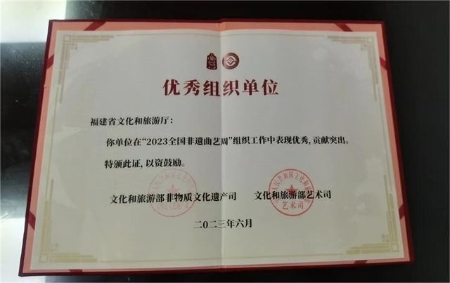 6月9日至15日,由文化和旅游部、湖北省人民政府主办的“曲艺荟江城 说唱新时代”2023全国非遗曲艺周在武汉隆重举办。我省福州评话、福州伬艺、南平南词、锦歌、东山歌册、答嘴鼓、讲古等7个曲艺类国家级非遗代表性项目精彩亮相,为江城及全国各地的曲艺同行们献上一道独具特色的曲艺盛宴。省文化和旅游厅二级巡视员张立峰、非遗处相关负责人参加了开幕式和座谈交流。6月12日至15日,以王素华,黄春慧两位国家级非遗代表性传承人领衔的30人福建展演团队进行了11场展演。团队进戏院、进校园、进社区、进景区、进机关,与当地群众交流互动,与全国同行同台展演,展示福建曲艺水平,传播福建非遗声音,赢得满堂喝彩,受到一致好评。活动期间,我省还参加了全国非遗曲艺传承发展座谈交流和“曲艺传承 闽韵流芳”曲艺传承发展计划成果展,省文化和旅游厅获优秀组织单位奖,进一步提升了福建曲艺的影响力和传播力。