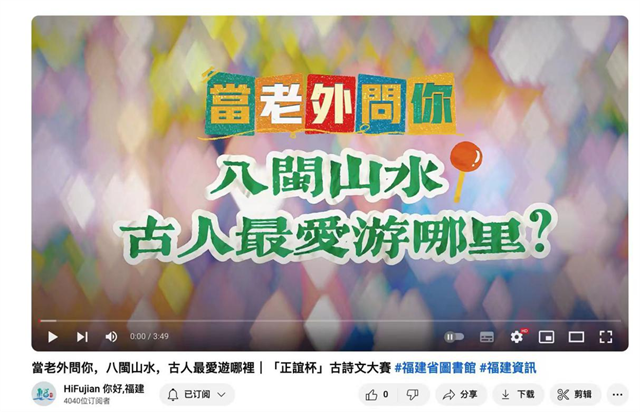 延伸传播渠道。发挥新闻传播作用,利用宣传全矩阵展示省图书馆文旅融合的具体做法,得到福建日报、图书馆报、中国报道等省内外主流媒体的关注与报道,全平台关注数逾十万;馆员自编自导邀请海外友人出镜拍摄“当老外问你‘八闽山水,古人最爱游哪里’”福建文旅宣传视频,在YouTube、ins等境外社交平台发布,向全球网民传播福建文旅声音。