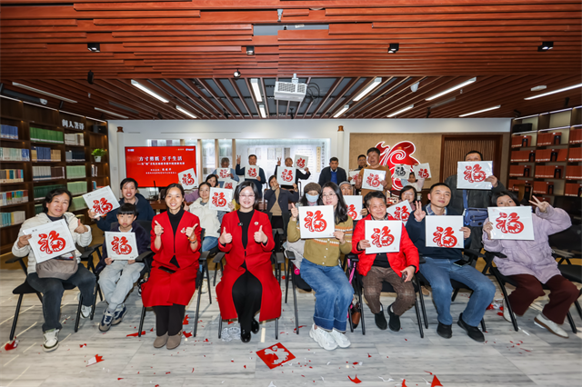 讲座特设“福”字剪纸体验环节,老少读者专注于手中红纸,在主讲人的指导下,依循从难到易、由内至外、去白留黑的技法小心剪雕,亲手剪裁精美窗花和融合马年生肖形象的创意“福”字,沉浸式体验剪纸乐趣。