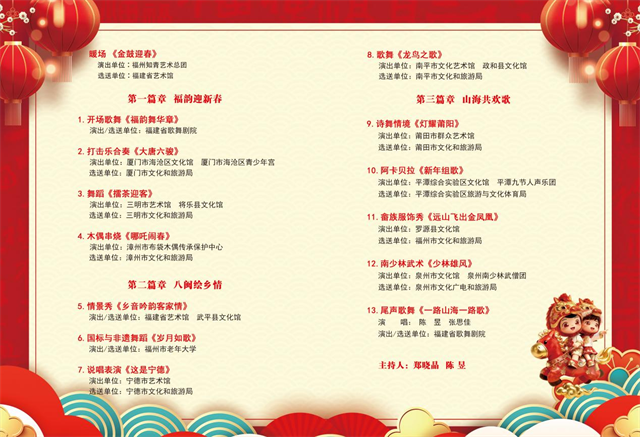 本次活动由福建省文化和旅游厅主办,福建省艺术馆、福建省歌舞剧院承办,联动全省九市一区文旅力量共同打造,不仅是一场群众文艺展演,更是一次可看、可玩、可尝、可体验的“闽式年味”大赏!