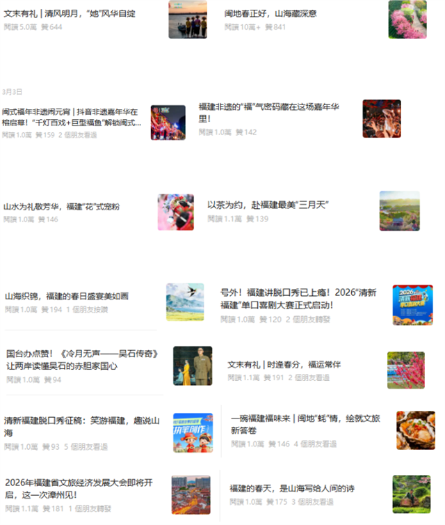 2026年3月,“清新福建 文旅之声”微信公众号以福建春日文旅、非遗民俗、特色美食为主线,联动明星热点、喜剧IP与本土文化,打造主题化、多元化、爆款化优质内容,实现内容传播、粉丝增长、用户互动三大维度全面突破,阅读量达50万+次,转发量2万+次,粉丝净增8300余人。