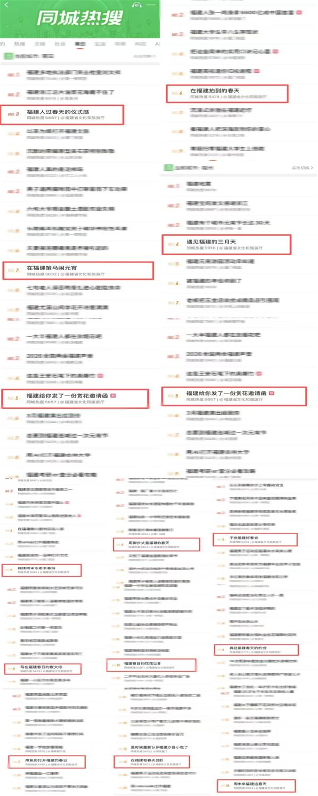 3月福建花事浪漫风和日丽,@福建省文化和旅游厅 微博平台在元宵节、女神节、花朝节等热门节点,以热点话题引导与同城热搜协同联动的运营策略,强化话题设置与能力,累计推动“福建人的春天仪式感”“在福建拍到的春天”“在福建策马闹元宵”等15个话题词登上微博同城热搜榜,有效激发网友互动意愿,为福建春季文旅市场注入强劲宣传动能。据统计,3月份,@福建省文化和旅游厅 共发布微博516条,总阅读量达1012万,转发数3.2万+,评论数1.1万+,点赞数3.6万+。