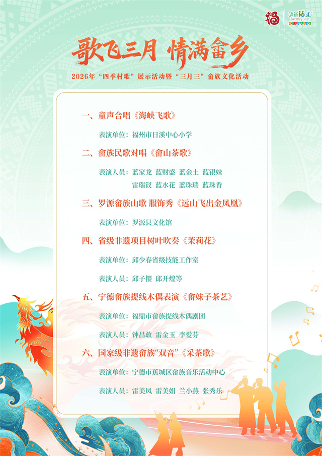 为全面贯彻落实“文艺赋美乡村”工作部署,紧扣“艺术点亮乡村”主题,进一步丰富基层群众精神文化生活,推动优质文化资源直达乡村,2026年“四季村歌”展示活动暨“三月三”畲族文化活动即将在福州市晋安区日溪乡盛大启幕!