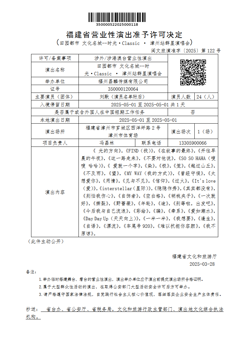 - 文 号: 闽文旅演准字〔2025〕第122号