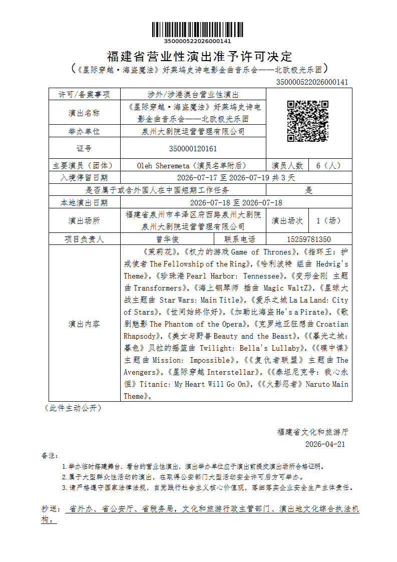 福建省营业性演出准予许可决定(《星际穿越·海盗魔法》好莱坞史诗电影金曲音乐会——北欧极光乐团)