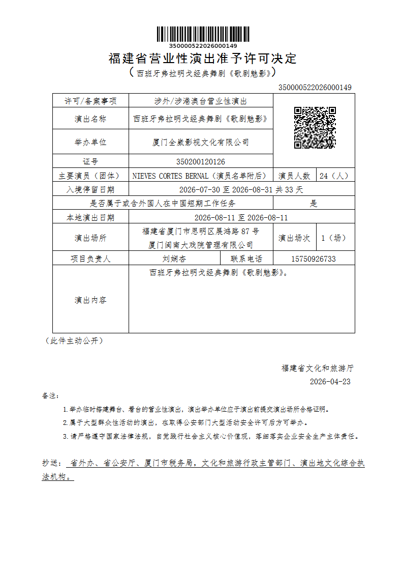 福建省营业性演出准予许可决定(西班牙弗拉明戈经典舞剧《歌剧魅影》)